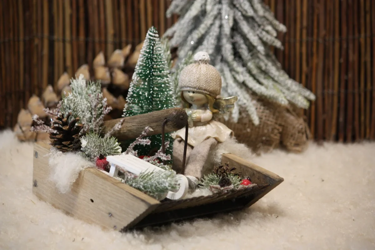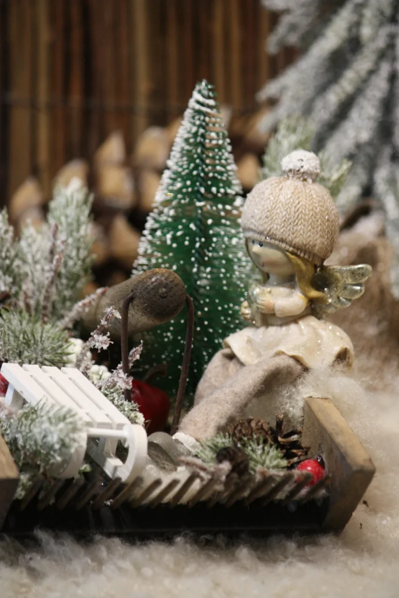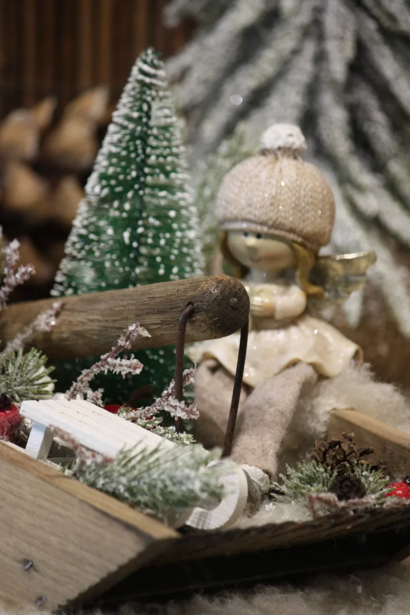 La petite angesse se balade avec sa luge en attendant Noël, une petite touche de douceur et de nostalgie pour votre décoration / Support véritable ancien peigne à myrtilles en bois et métal / Petite angesse en résine et feutrine / Petite luge en bois / Fausse fourrure / Véritables pommes de pin et divers fruits / Sapins, branchage et baies artificiels / Création artisanale, par Boiseline