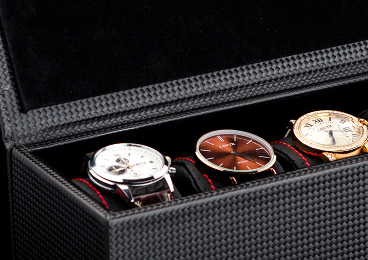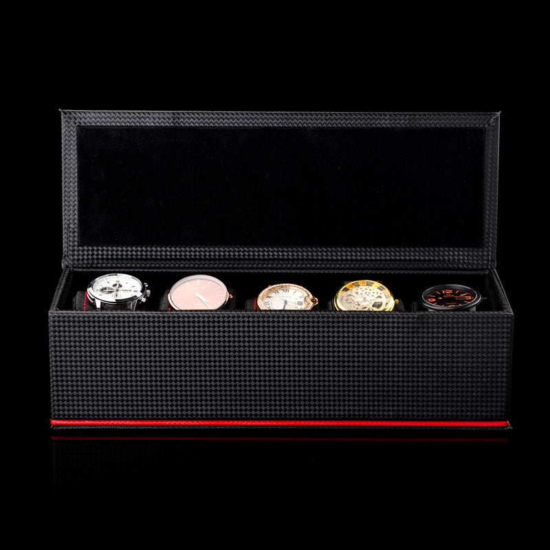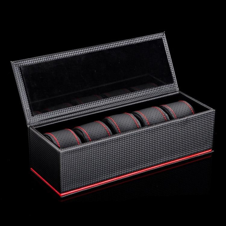 Fabrication artisanale en fibre de Carbone synthétique, ce modèle est doté d’un liseré rouge à la base et d’une doublure en cuir de luxe avec une surpiqûre rouge pour plus d’esthétique. Elle peut contenir jusqu’à 5 montres grâce à des compartiments individuels et à une fermeture à clap. Un cadeau idéal !