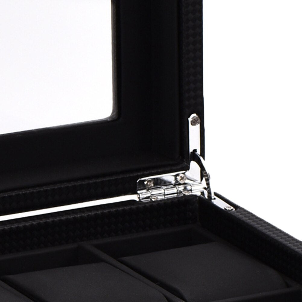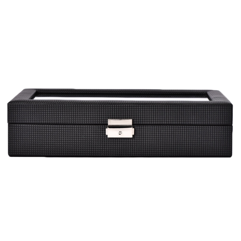 Cette magnifique boîte contient 12 coussins en velours noir synthétique pouvant accueillir toutes les tailles de montres. L’extérieur est recouvert de fibre de carbone synthétique avec une vitre transparente pour admirer vos montres. Fermeture à clip métallique et clef.