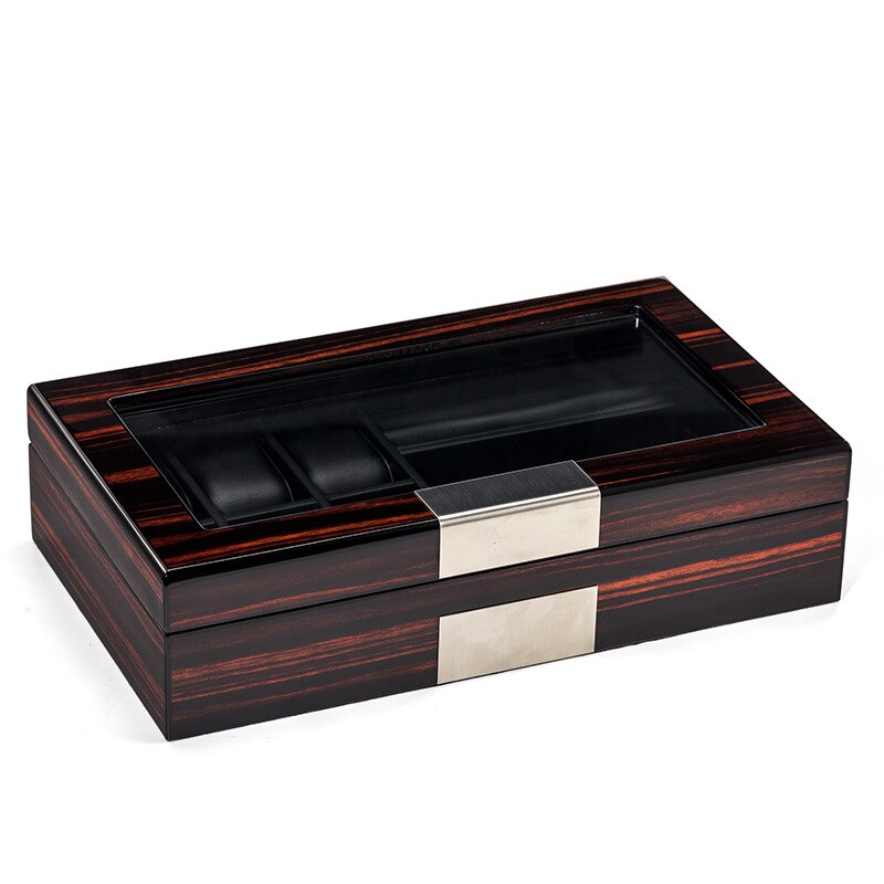 Avec un intérieur doublé de velours, une fenêtre en verre pour admirer les montres et une fermeture à clip dorée, cette boîte en bois de noyer a une capacité de 6 montres et est à la fois élégante, simple et classique.