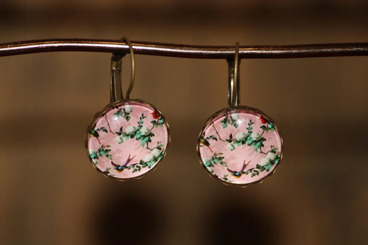 Cabochon dormeuse verre sur boucle en métal bronze. Papier origami avec pour motif de petites fleurs et des oiseaux.