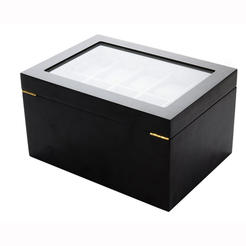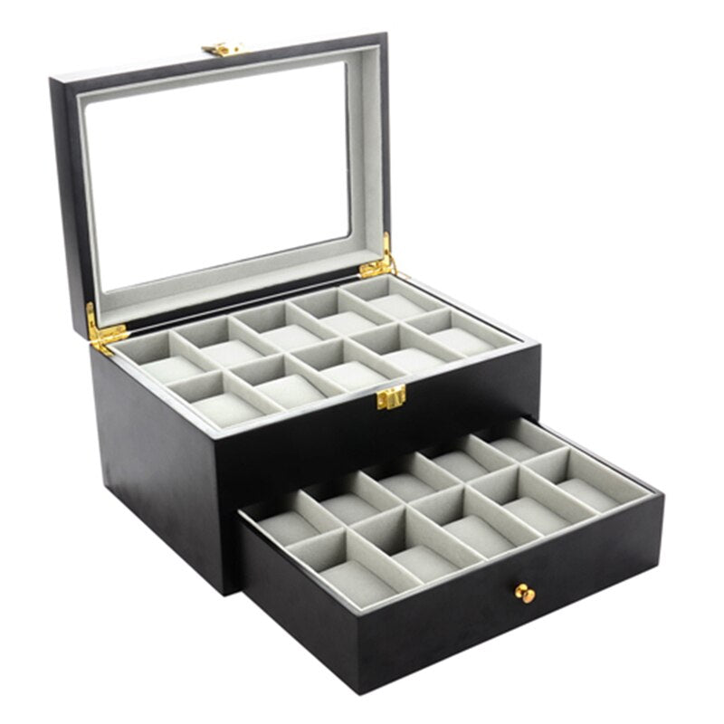 Ce meuble peut contenir jusqu’à 20 montres, avec un tiroir pour ranger jusqu’à 10 horloges que vous porterez que le week-end par exemple, ce qui vous permet de mettre les montres de la semaine sur le dessus. Grâce au verre, vous avez la possibilité d’exposer vos montres préférées sans ouvrir le coffret, et l’intérieur est en velours doux qui amortit et protège chaque pièce d’horlogerie. De plus, de superbes charnières, clips et boutons sont en traitement or pour sublimer ce coffret en bois . C’est le cadeau parfait pour un anniversaire, ou pour les passionnés de l’horlogerie qui rêvent de regrouper toutes leurs garde-temps en un seul endroit !