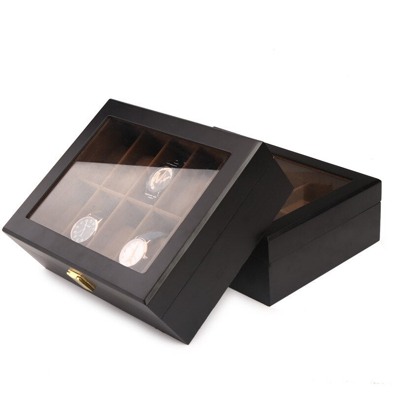 Boîte d’affichage élégante en bois massif noir pour Montre, intérieur en velours marron avec 12 emplacements et verre pour voir à travers.