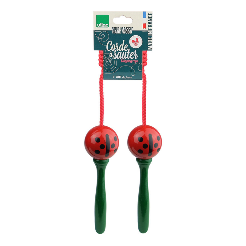 Une adorable Corde à sauter Coccinelle pour des heures de jeu à la récré. Cette corde réglable est en bois massif laqué 100% made in France dans le Jura.