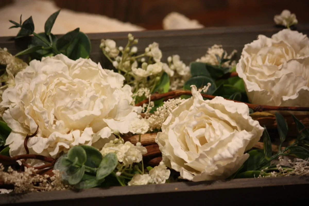 Cette décoration florale apportera une jolie touche de romantisme à votre intérieur / Plateau gris en bois / Feuilles artificielles / Fleurs artificielles / Véritables fleurs / Sarment de vigne / Dentelle ancienne / Création artisanale et unique, par Boiseline