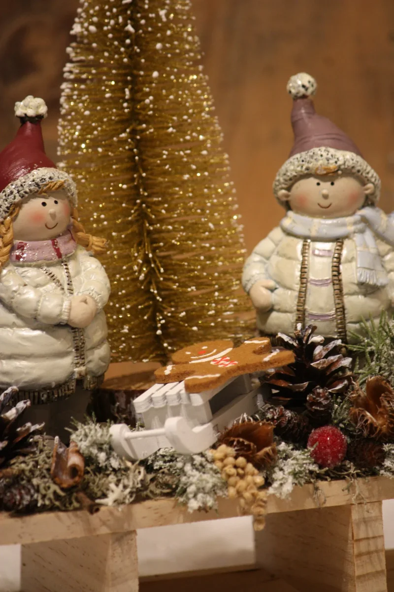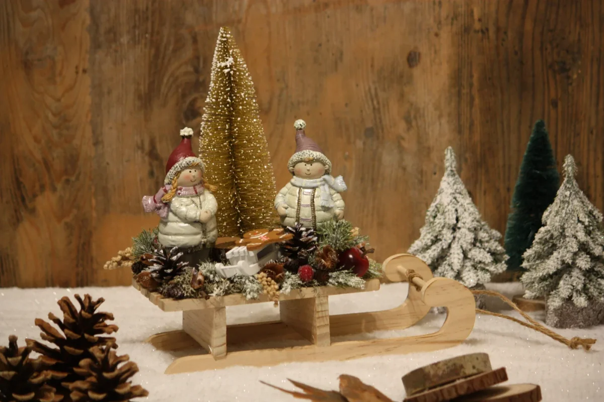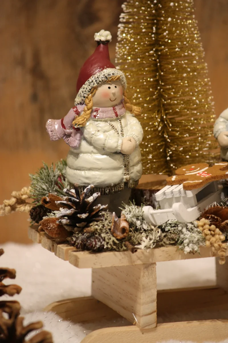 La balade des 2 petits enfants avec un petit mannala en luge au milieu de la forêt enneigée donnera une touche hivernale à votre décoration / Petite fille et petit garçon en résine / Mannala en feutrine / Sapin artificiel doré / Luge en bois / Véritables lichen, fleurs séchées, faînes, pommes de pin, coques de gland / Pommes et baies artificielles / Création artisanale, par Boiseline