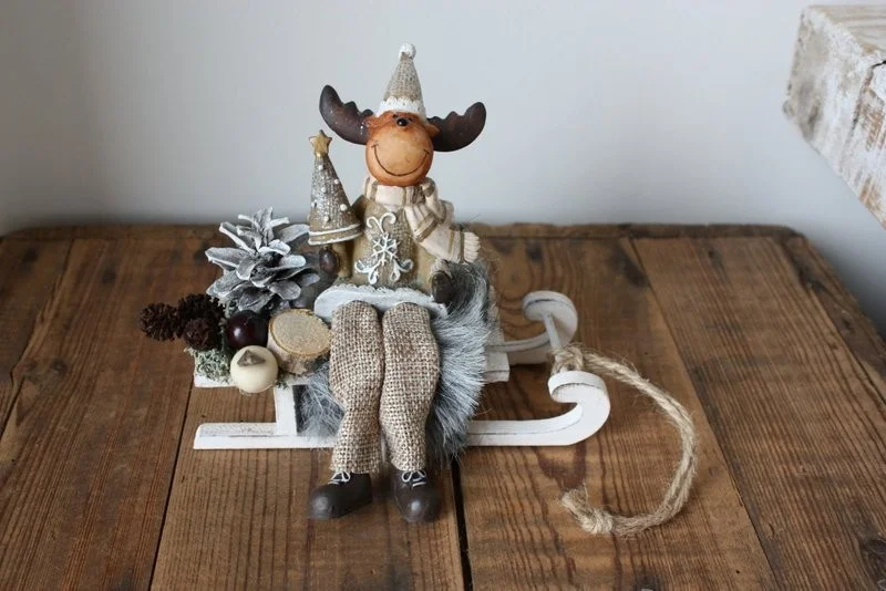 Petite promenade en luge blanche du renne de Noël, avec son plaid en fourrure grise, entouré de pomme de pin, de mousse et de baies / Création artisanale, par Boiseline
