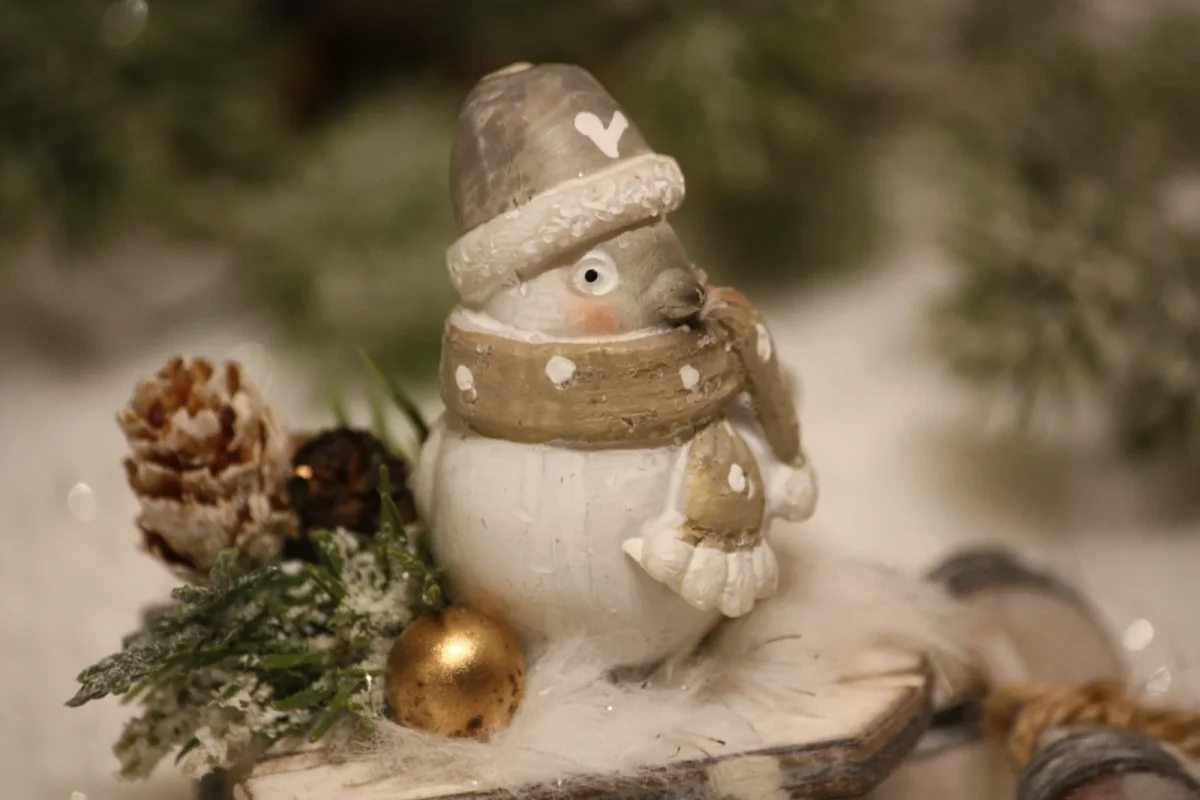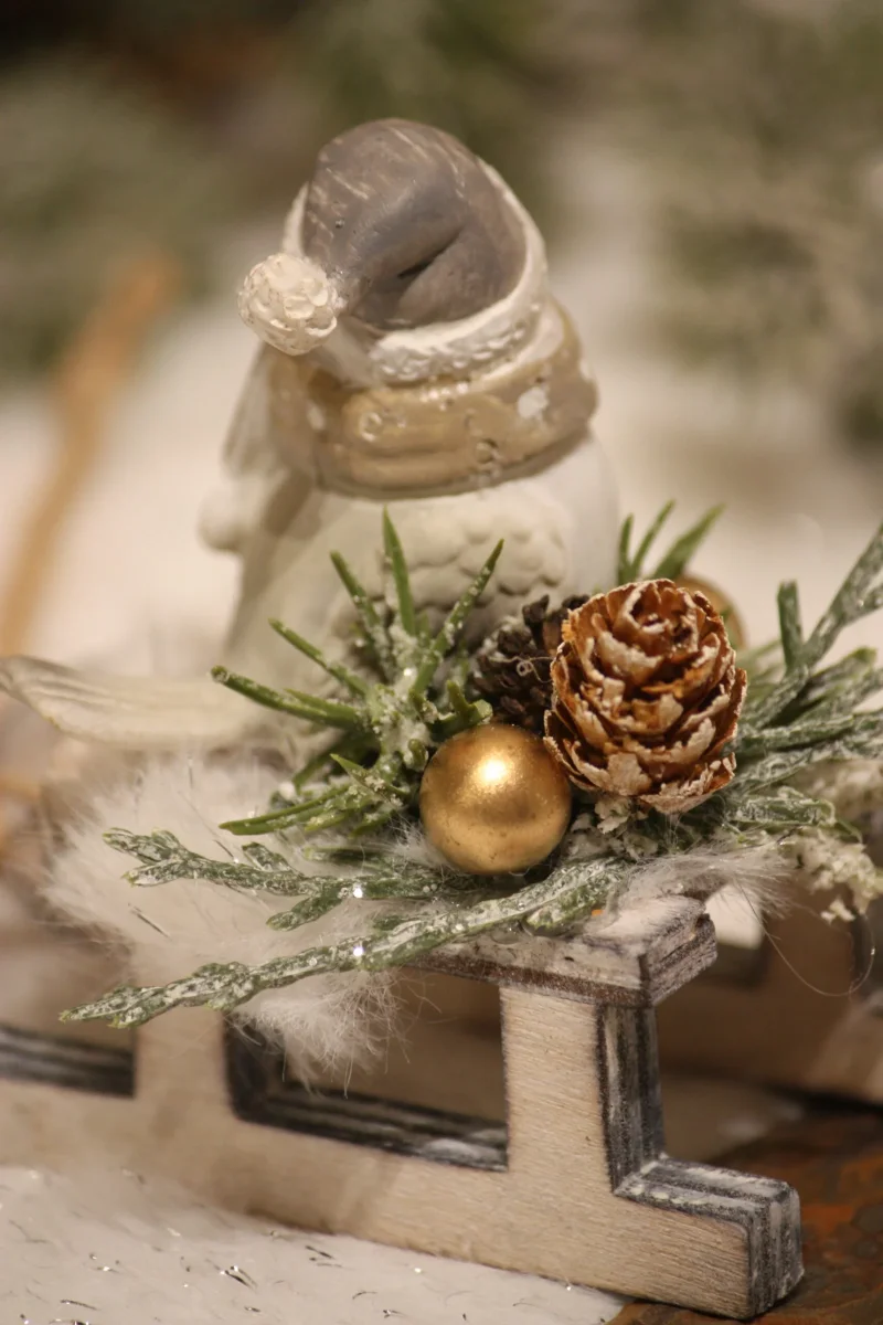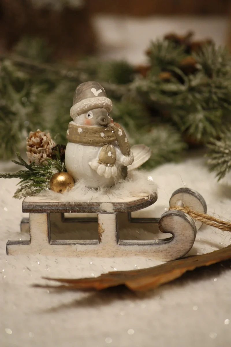 Petite promenade du petit oiseau sur sa luge avec son plaid en fourrure / Luge en bois / Petit oiseau en résine / Véritable pomme de pin / Baies et sapins artificiels / Fausse fourrure / Création artisanale, par Boiseline