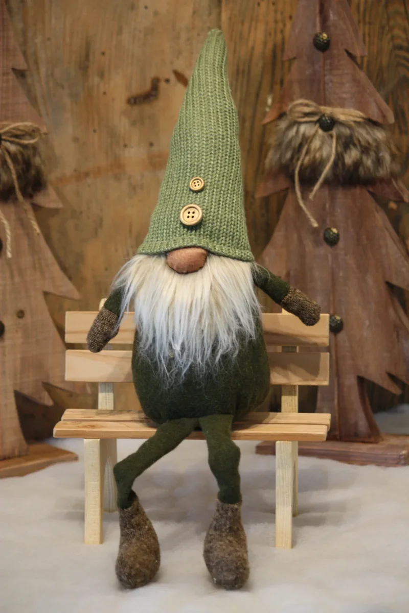 Ce petit lutin à la barbe beige et au bonnet vert se balade pour trouver une maison qui saura l’accueillir, il y apportera beaucoup de bonheur et veillera secrètement sur la petite famille. Corps en tissu rempli de ouatine et de sable / Bonnet vert en laine / Boutons en bois / Barbe en fausse fourrure.