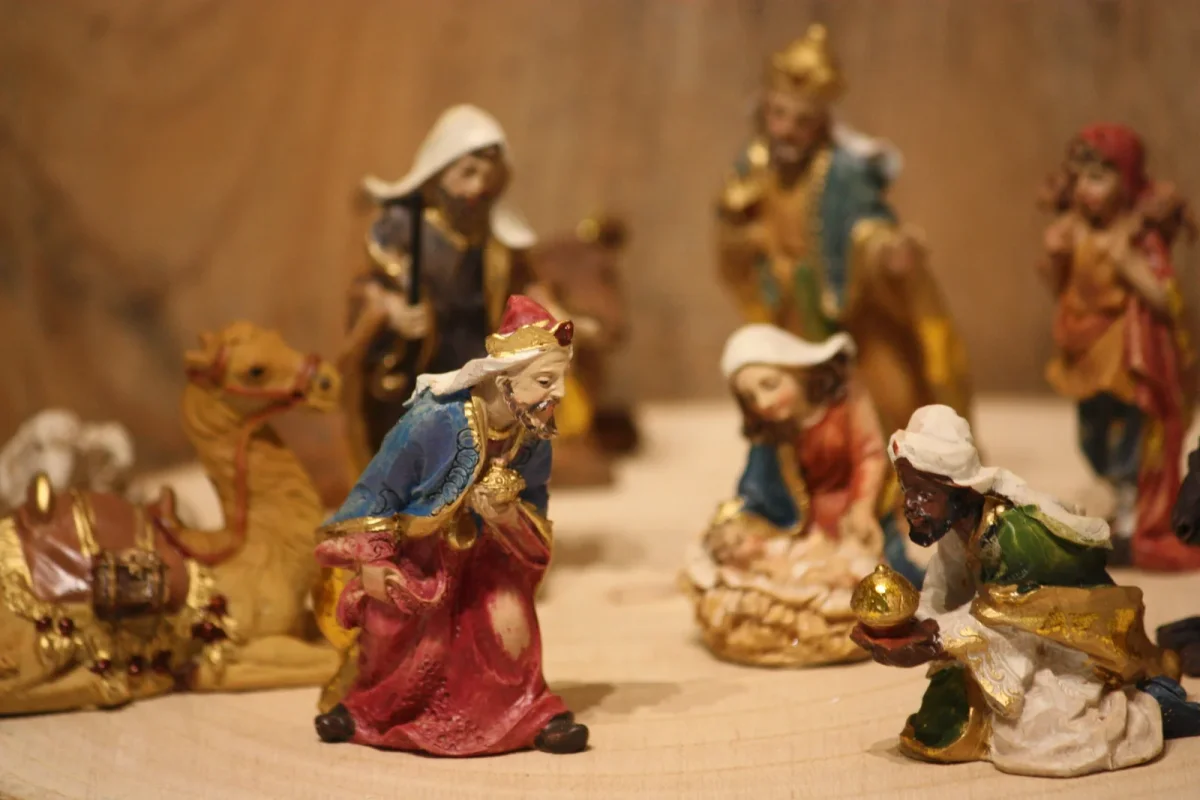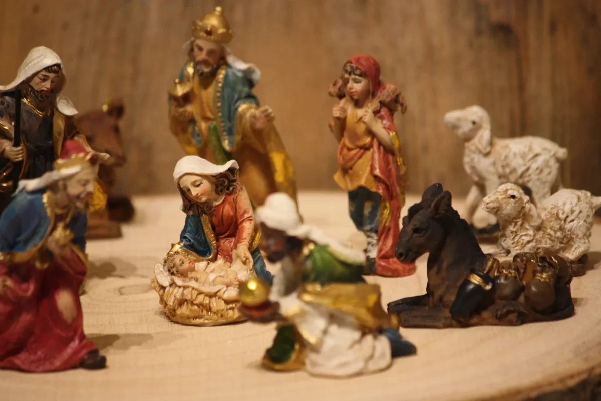La scène de la Nativité est complète avec le petit Jésus dans son berceau, Marie, Joseph, l’âne, le bœuf, des agneaux bienveillants, un berger et les trois rois mages.