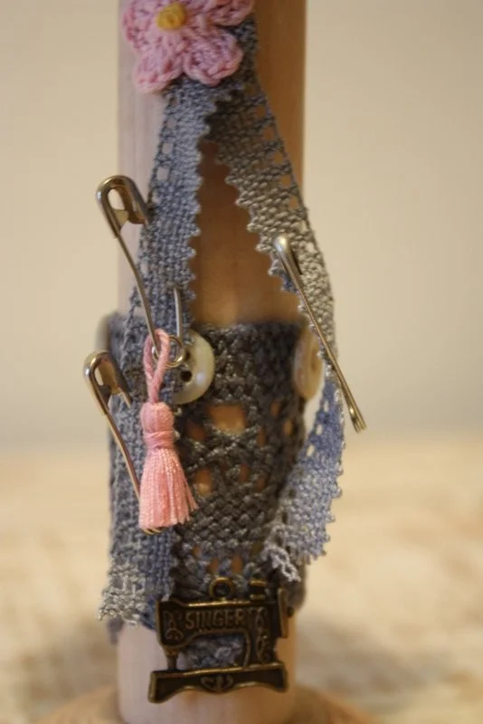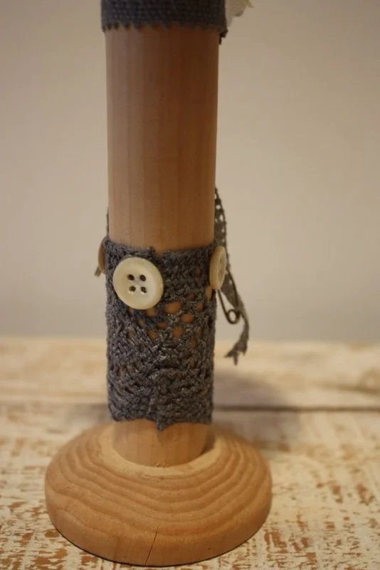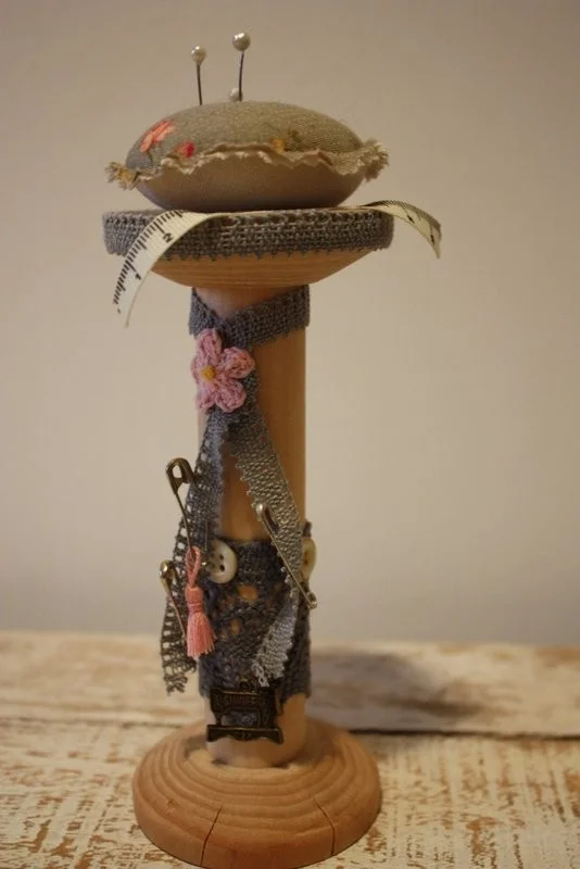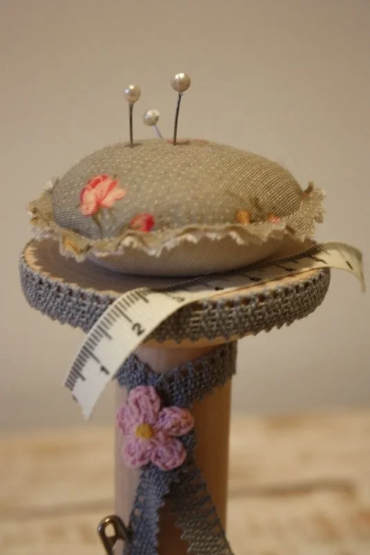Ne cherchez plus vos aiguilles et épingles grâce à cette ancienne bobine de fil en bois décorée et transformée en porte-aiguilles et porte épingles. Petit coussin porte-aiguilles en tissu gris-bleu avec petites roses. Ruban de dentelle pour accrocher les épingles / Création artisanale, par Boiseline