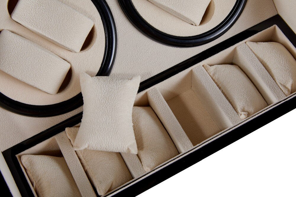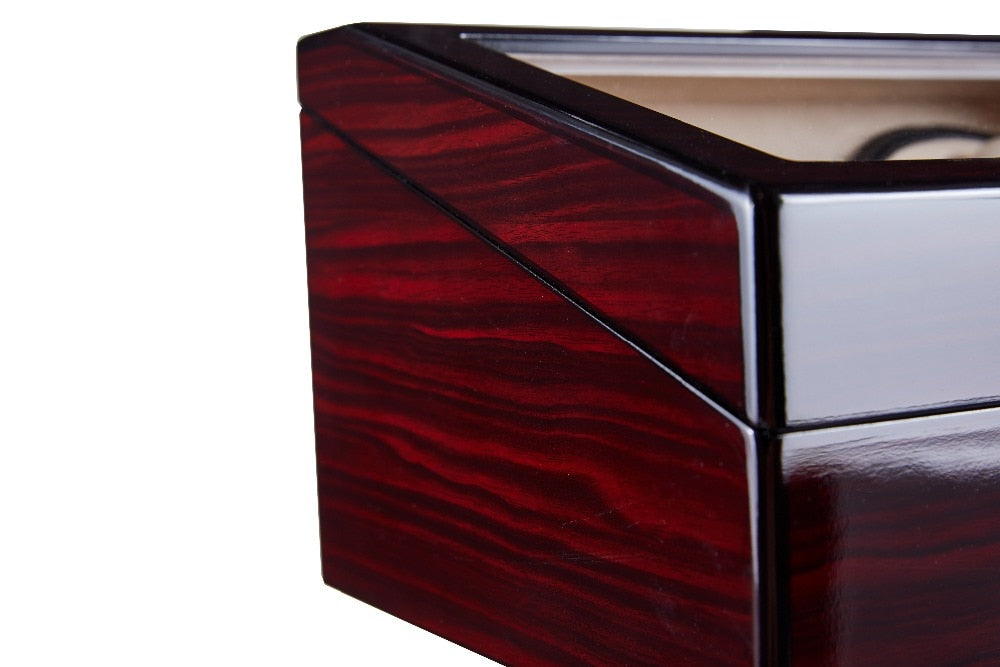 L’extérieur est un très beau bois piano bordeaux avec sur l’angle un vitre permettant de voir les montres lorsque le coffret et fermé. L’intérieur du remontoir est doublé de velours blanc, vous pouvez également stocker jusqu’à 6 montres sur le devant, capable de réveiller jusqu’à 4 montres automatique en même temps.
