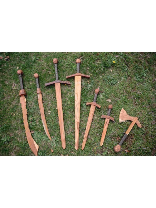 Sabre en bois naturel très résistant avec manche recouvert de cuir synthétique. Sculpté à la main, créant une pièce de décoration unique.