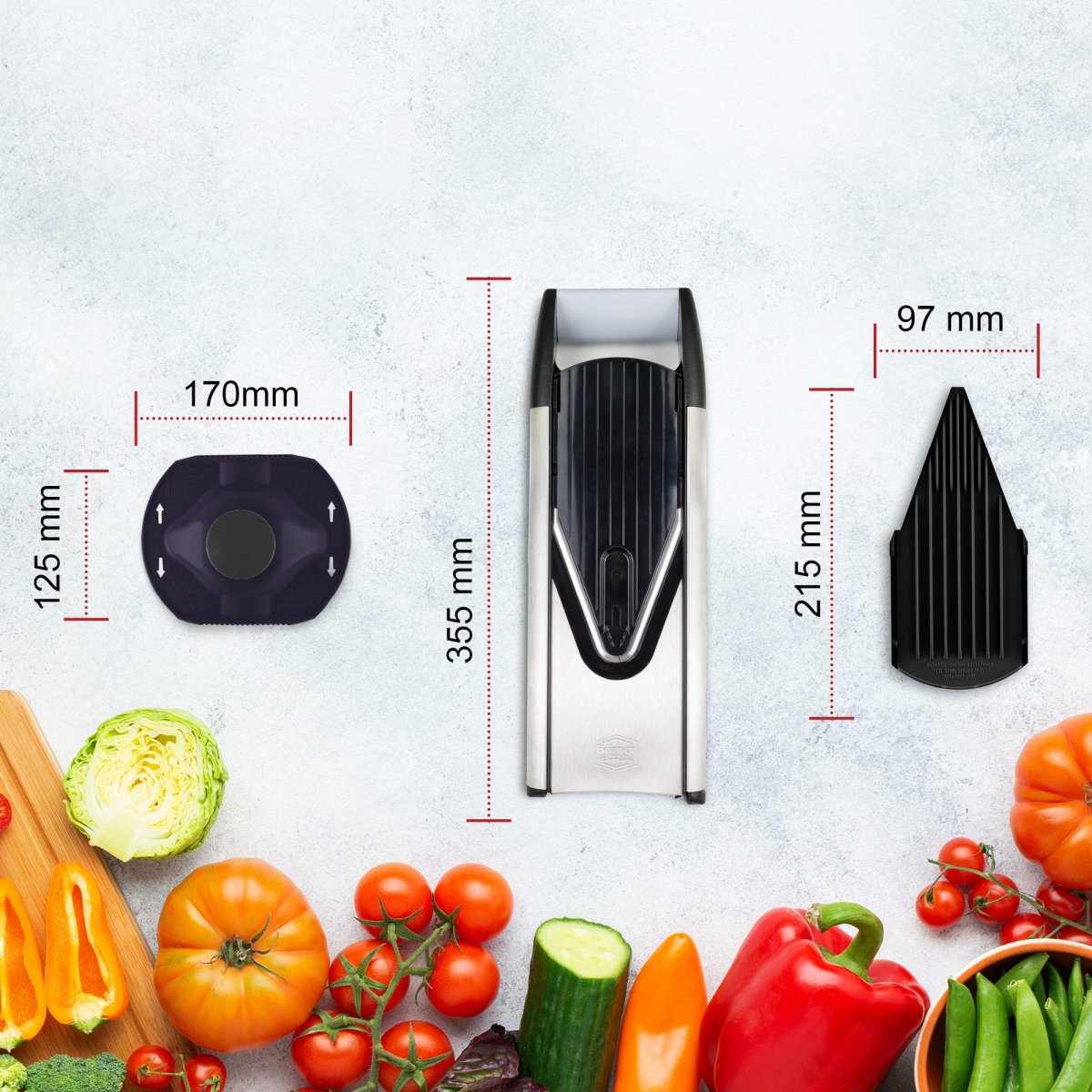 Complétez-le avec des accessoires supplémentaires, et agrémentez votre mandoline V6 avec d’autres plaques de coupe pour de nouvelles formes de coupe.