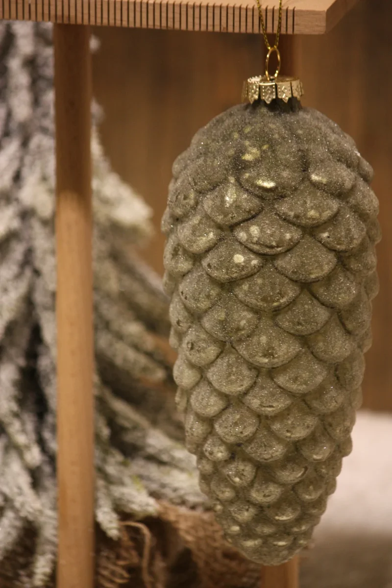Apportez un peu de douceur de la nature dans votre décoration avec cette pomme de pin couleur vert à l’aspect gelé, à suspendre ou à poser / Pomme de pin mate en verre laqué / Petite ficelle pour suspendre