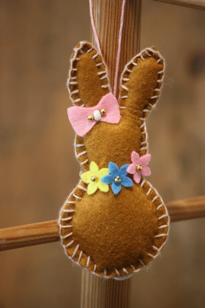 1 Lapin de Pâques en feutrine de couleur taupe : fleurs en feutrine de couleur jaune et verte ainsi qu’un flot rose foncé réf. DECOPAQ0031