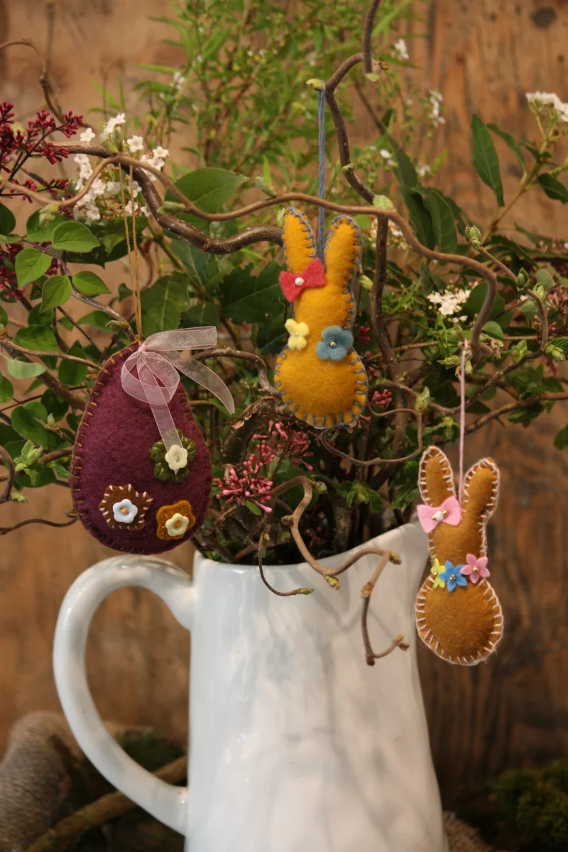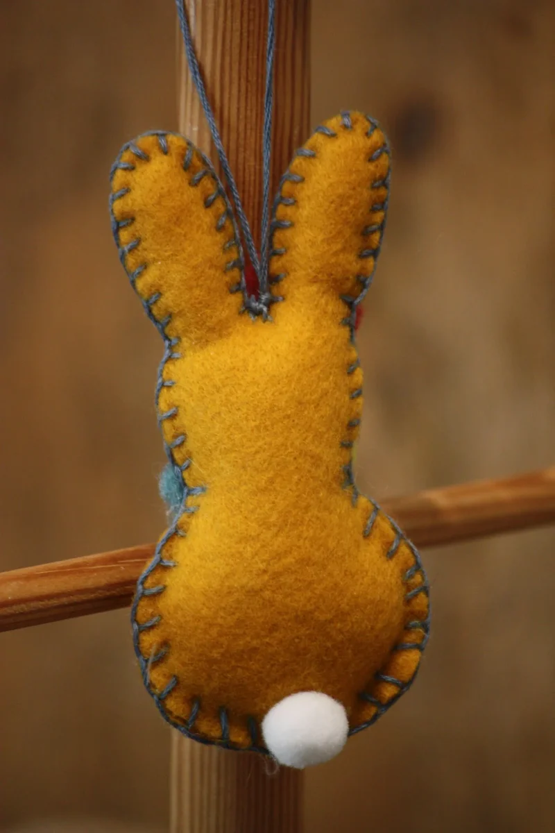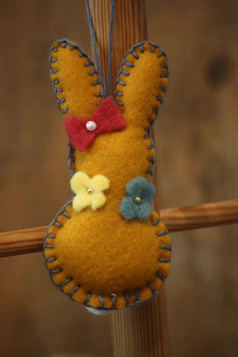 Cette suspension d’un lapin en feutrine couleur moutarde apportera une touche de poésie à votre décoration de Pâques grâce au motif de petites fleurs et de petites perles. Lapin en feutrine moutarde / Petites perles en métal / Petites fleurs en feutrine de couleur bleue et jaune ainsi qu’un petit flot rose foncé / Petit pompon blanc / Petite ficelle pour suspendre / Création artisanale, par Boiseline.