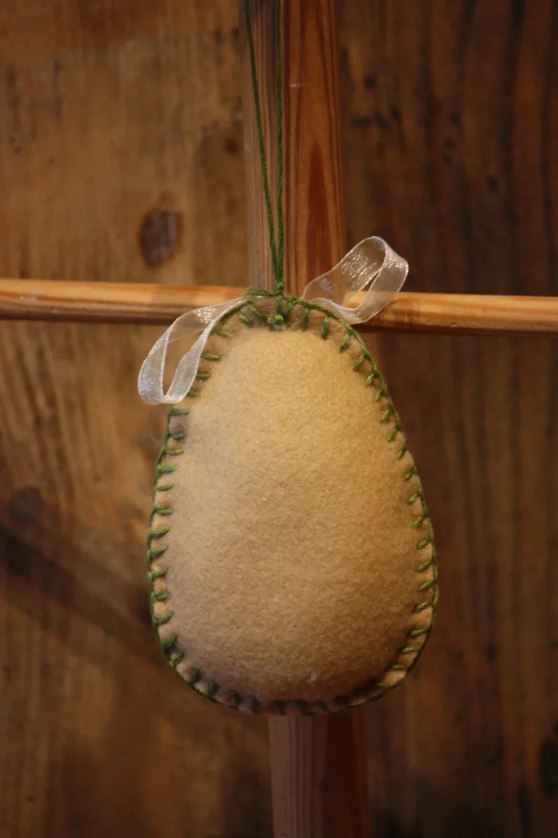 Cette suspension en feutrine taupe, en forme d’oeuf apportera une touche de poésie à votre décoration de Pâques grâce au motif de petites fleurs. Oeuf en feutrine taupe / Petites fleurs en feutrine de couleur verte, moutarde, pourpre / Petits boutons en plastique en forme de fleurs / Petite ficelle et ruban en organza pour suspendre / Création artisanale, par Boiseline.