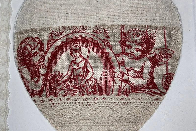 Le coeur central découpé de ce tableau permet d’y intégrer une touche de romantisme qui ravira votre intérieur. Tableau à suspendre ou à poser / Cadre blanc en bois / tissu en lin motif anges / dentelle / bouton en céramique motif fleur / Création artisanale, par Boiseline